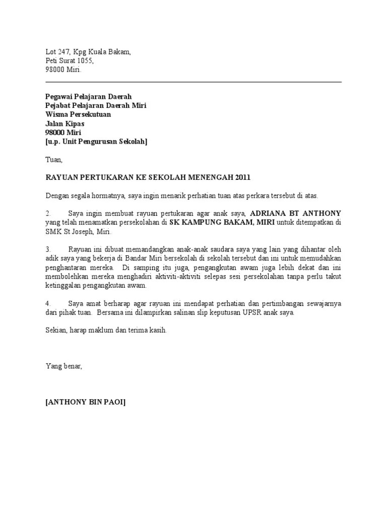 Pindah contoh surat pertukaran sekolah anak. Menyediakan surat iringan (surat permohonan pertukaran) untuk ditandatangani oleh pengetua. Pdf contoh surat rayuan eg tukar zuebir othman academia edu.